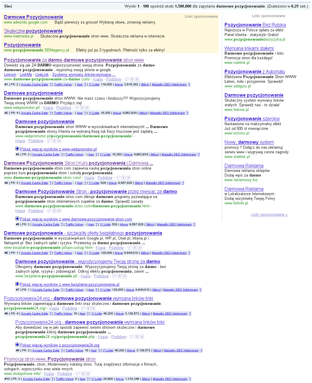 W przypadku wyników organicznych, pierwsze dwa wyniki odnoszą się do systemów wymiany linków (mogą być bezpłatne, ale najpierw trzeba sporo zainwestować w co innego). Wśród dalszych wyników darmowy kurs pozycjonowania, dalej swl oraz oferta 90 dni pozycjonowania za darmo (można to przyjąć jako spełniające kryterium).