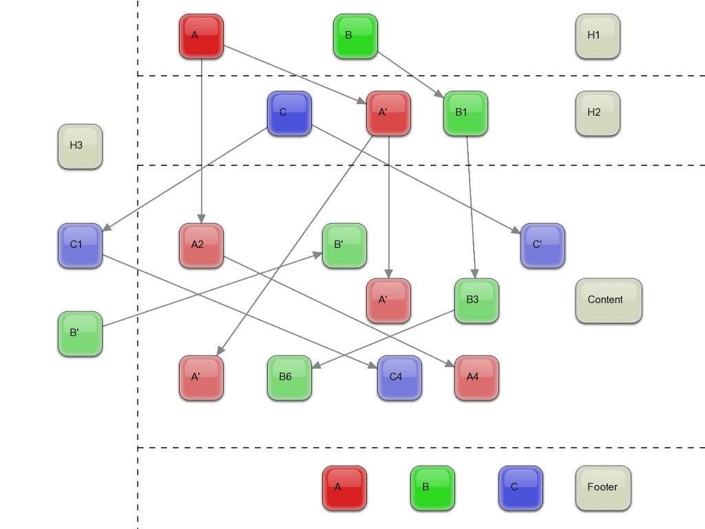 Najczęściej spotykaną formą rozmieszczania treści na stronie jest struktura drzewiasta, czyli od najistotniejszych słów kluczowych w górnej części strony (dokładnie górnej lewej, o czym napiszę przy optymalizacji pod użytkownika) rozchodzących się w coraz mniej istotne słowa schodząc w dół strony (header – contain – footer). Zgodnie z tą strukturą (najważniejsze – najmniejważne) wykorzystujemy znaczniki html. Do dyspozycji mamy ich sporo, do ważniejszych należą – title, h1 … h6, strong, underline, em, color. Moim zdaniem warto rozszeżyć budowanie struktury o elemeny macierzy. Taki mały obrazek dla zobrazowania.